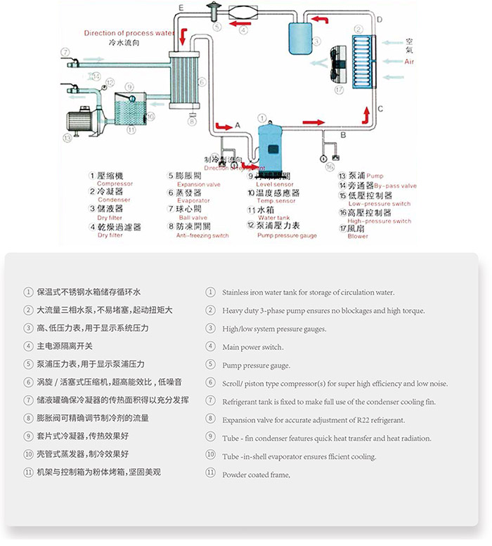 The system adopts a single closed loop design for refrigeration system. Refrigerant is alternatively changed from ga關注網頁關注登錄器調整網絡us to liquid state to absorb or release heat thus a cooling effect is achieved. When the machine is started, compressor starts working. Refrigerant is compressed into high pressure and high temperature gas in the process from A to B. In the process From B to C and D, this high pressure and high temperature gas is cooled when it is passing through the condenser and changed into liguid. Heat is taken away by the cooling air. In the process from D to E, the pressure of liquid refrigerant is reduced by expansion valve and a part of the refrigerant is changed from liquid to ga關注網頁關注登錄器調整網絡us state. In the process from E to A, refrigerant absorbs the heat of process water in the evaporator and returns back to the compressor. This heat exchange process repeats until process water is cooled down to required temperature.
