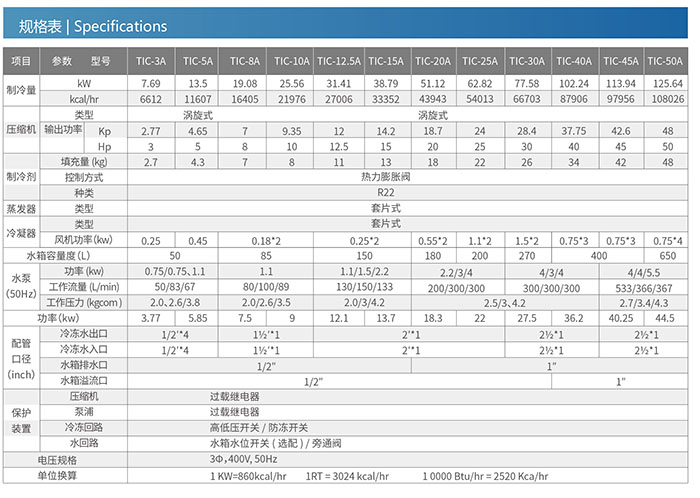 1) The refrigeration capacity is measured according to the outlet temperature of 12C and the ambient temperature of 30°C;