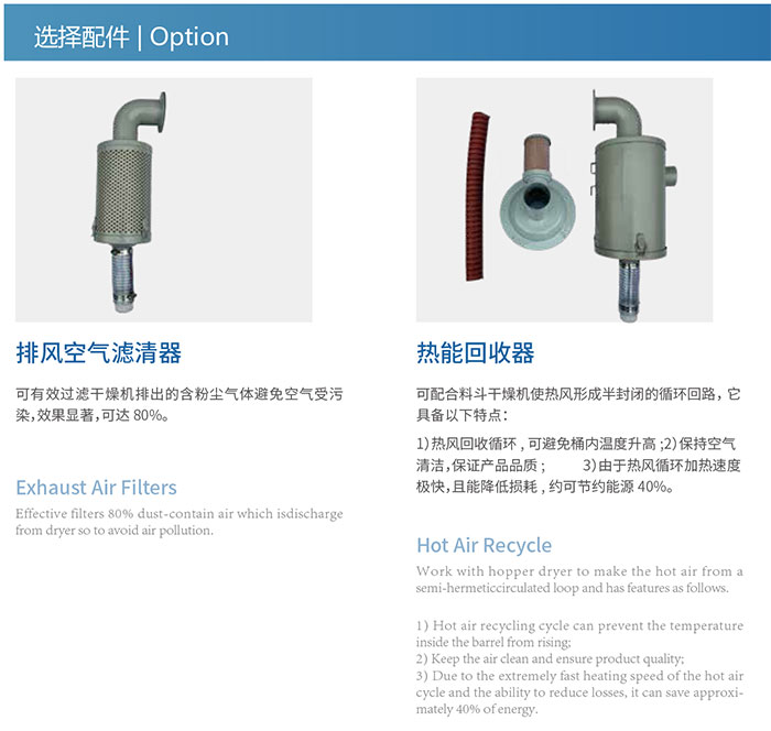 More optional accessories:“L”“A”type floor stand,dried-material suction box,hopper magnet,magnetic base,hot air recycler,blower inlet