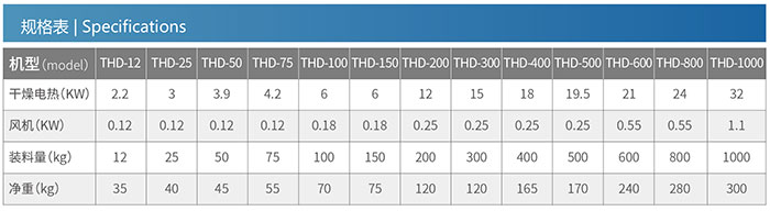 THD-800 and THD-1000 have down-blowing air pipe and accessible door for easy material clearance)of the hopper with capacity rang?ing from 12kg to 1000kg. all models can be supplied with optional 24 hours auto start/stop timer.