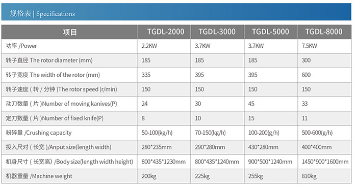 The crushing chamber is redesigned and its size is increased at the same time. Even the larger gate material can be easily put into the woman, so the GDL series has a wider range of application. The rotor is supported on two bearings, and its diameter is designed to maximize the width of the rotor, making it possible to chop up chunks. In addition, the stepped rotor blade design allows only one cutter to be cutting at any one time, thus increasing cutting torque. For these reasons, the GDL series machines are suitable for cutting dense materials and thick-walled gates.