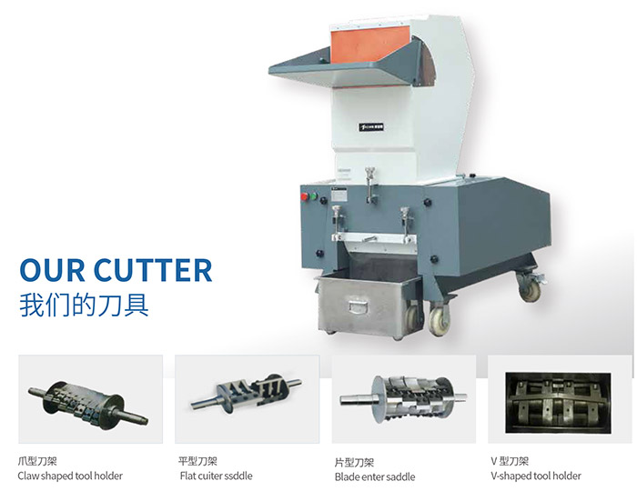 The structure of blade cutter is between claw cutter and flat cutter, which is suitable for crushing ordinary sheet, pipe, profile, plate and packaging materials and other plastic products and gate. General plastic crusher, using sealed bearing, so that the bearing rotation for a long time to keep good; Reasonable cutter design, uniform product particles; Knife block heat shrinkable treatment, beautiful appearance design.
