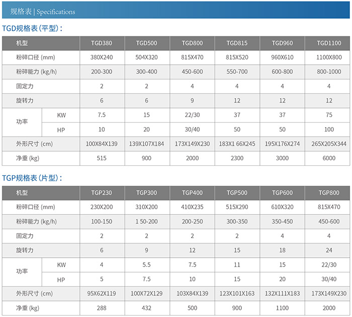 TG-D-P 類型受損機,以分成爪型開裂機類型,平型開裂機類型,片型開裂機類型。以下艙位合吃面廣,供各式pp塑料機器設備,受損收受交接